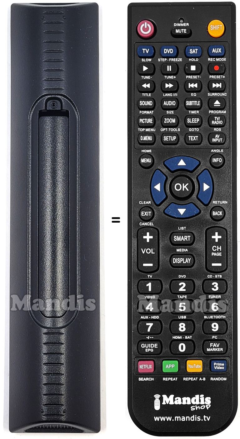 Below, we will show you the correspondence between each button on the original remote control and the button that performs the same function on the replacement remote control. In some cases, you may need to press the SHIFT key before pressing another button to perform certain actions. These additional functions are often not widely used and are included to facilitate understanding of the replacement remote control, or because the original remote control has more buttons than its equivalent.