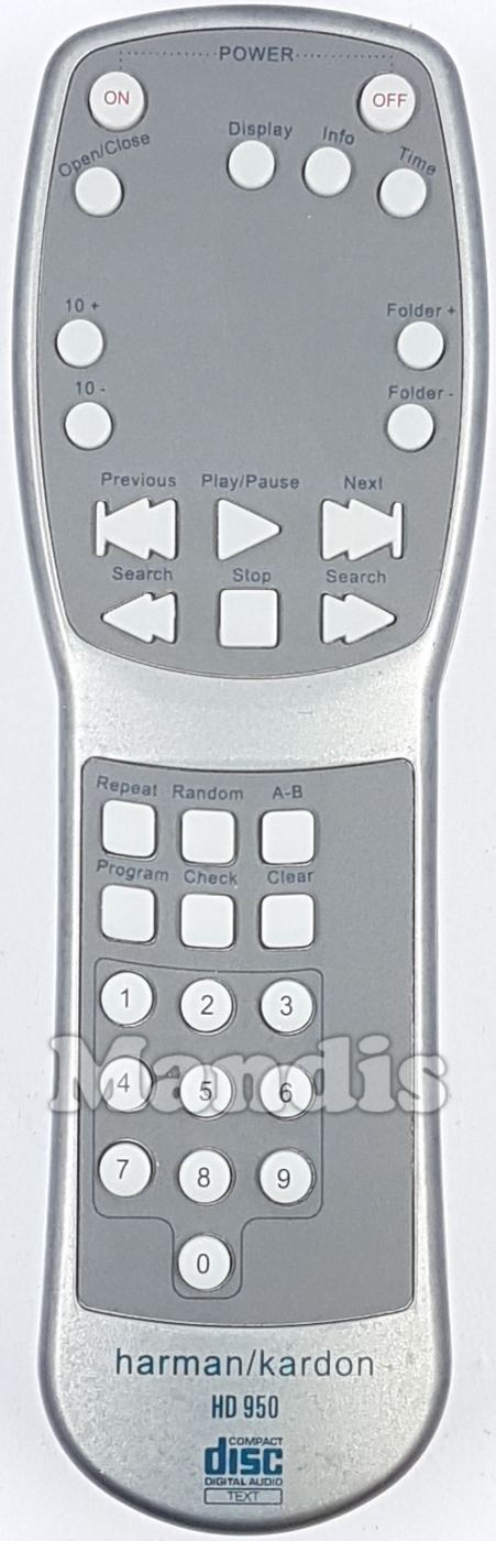 This remote control has the following buttons: On, Off, Open/Close, Display, Info, Time, 10+, 10-, Folder+, Folder-, Play/Pause, I<<, >>I, >>, <<, Stop, Repeat, Random, A-B, Check, Clear, Program, 1, 2, 3, 4, 5, 6, 7, 8, 9, 0