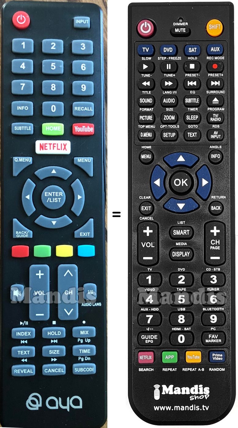 Below, we will show you the correspondence between each button on the original remote control and the button that performs the same function on the replacement remote control. In some cases, you may need to press the SHIFT key before pressing another button to perform certain actions. These additional functions are often not widely used and are included to facilitate understanding of the replacement remote control, or because the original remote control has more buttons than its equivalent.