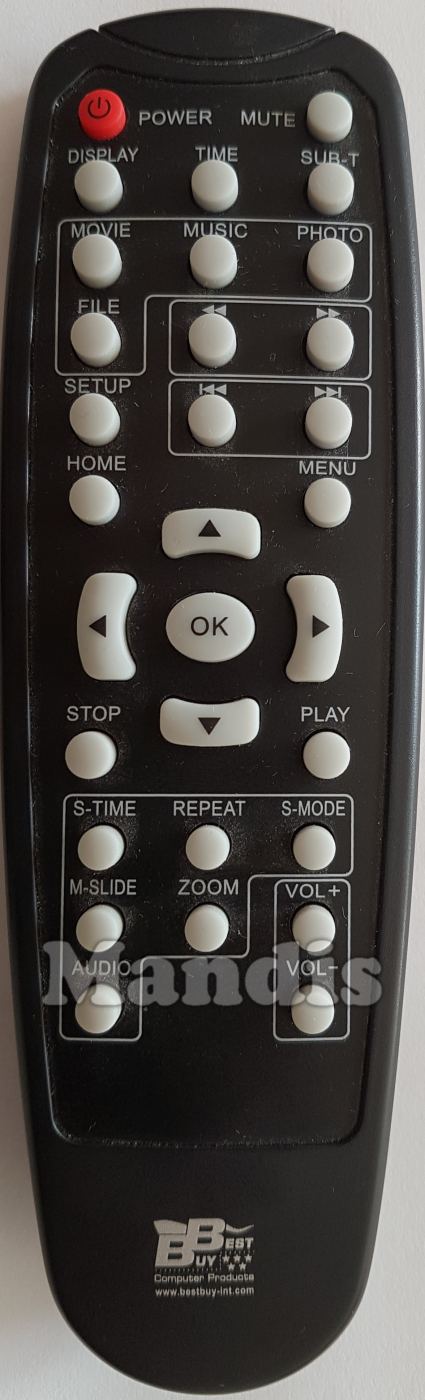 Power, Mute, Display, Time, SUB-T, Movie, Music, Photo, File, Setup, Home, <<, >>, I<<, >>I, Menu, Up, Down, Left, Right, OK, Stop, Play, S-Time, Repeat, S-Mode, M-Slide, Zoom, Audio, Vol+, Vol-