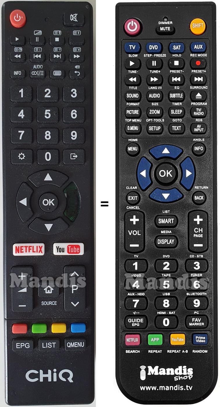 Below, we will show you the correspondence between each button on the original remote control and the button that performs the same function on the replacement remote control. In some cases, you may need to press the SHIFT key before pressing another button to perform certain actions. These additional functions are often not widely used and are included to facilitate understanding of the replacement remote control, or because the original remote control has more buttons than its equivalent.