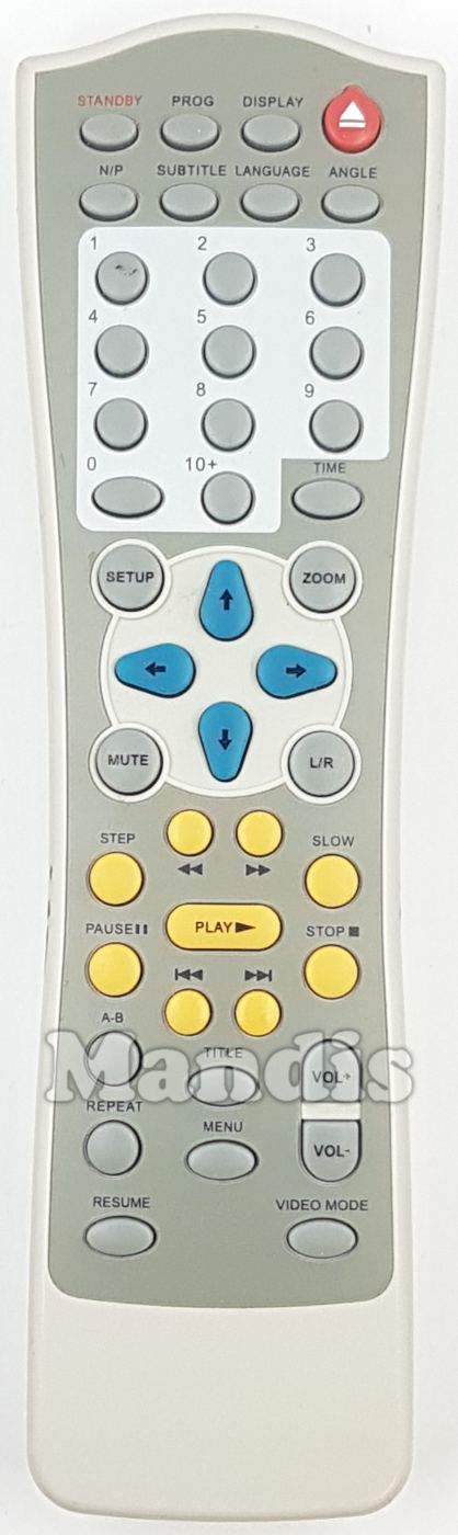 Standby, PROG, Display, Power, N/P, Subtitle, Language, Angle, 1, 2, 3, 4, 5, 6, 7, 8, 9, 0, 10+, Time, Setup, Zoom, Mute, L/R, Step, <<, >>, Slow, Pause, Play, I<<, >>I, Stop, A-B, Title, Repeat, Menu, Vol+, Vol-, Resume, Video Mode, Up, Down, Left, Right