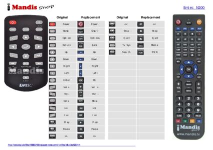 Below, we will show you the correspondence between each button on the original remote control and the button that performs the same function on the replacement remote control. In some cases, you may need to press the SHIFT key before pressing another button to perform certain actions. These additional functions are often not widely used and are included to facilitate understanding of the replacement remote control, or because the original remote control has more buttons than its equivalent.