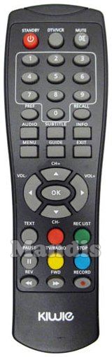 Mute, Power, 1, 2, 3, 4, 5, 6, 7, 8, 9, 0, Fav, Recall, Audio, Subtitle, Info, Menu, EPG, Exit, Up / CH +, Down / CH -, Right / Vol +, Left / Vol -, OK, Text, Red, Green / Rec List, Pause, Yellow / TV/Radio, Stop, << REV, >> FWD, Record