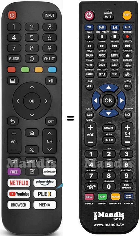 Below, we will show you the correspondence between each button on the original remote control and the button that performs the same function on the replacement remote control. In some cases, you may need to press the SHIFT key before pressing another button to perform certain actions. These additional functions are often not widely used and are included to facilitate understanding of the replacement remote control, or because the original remote control has more buttons than its equivalent.