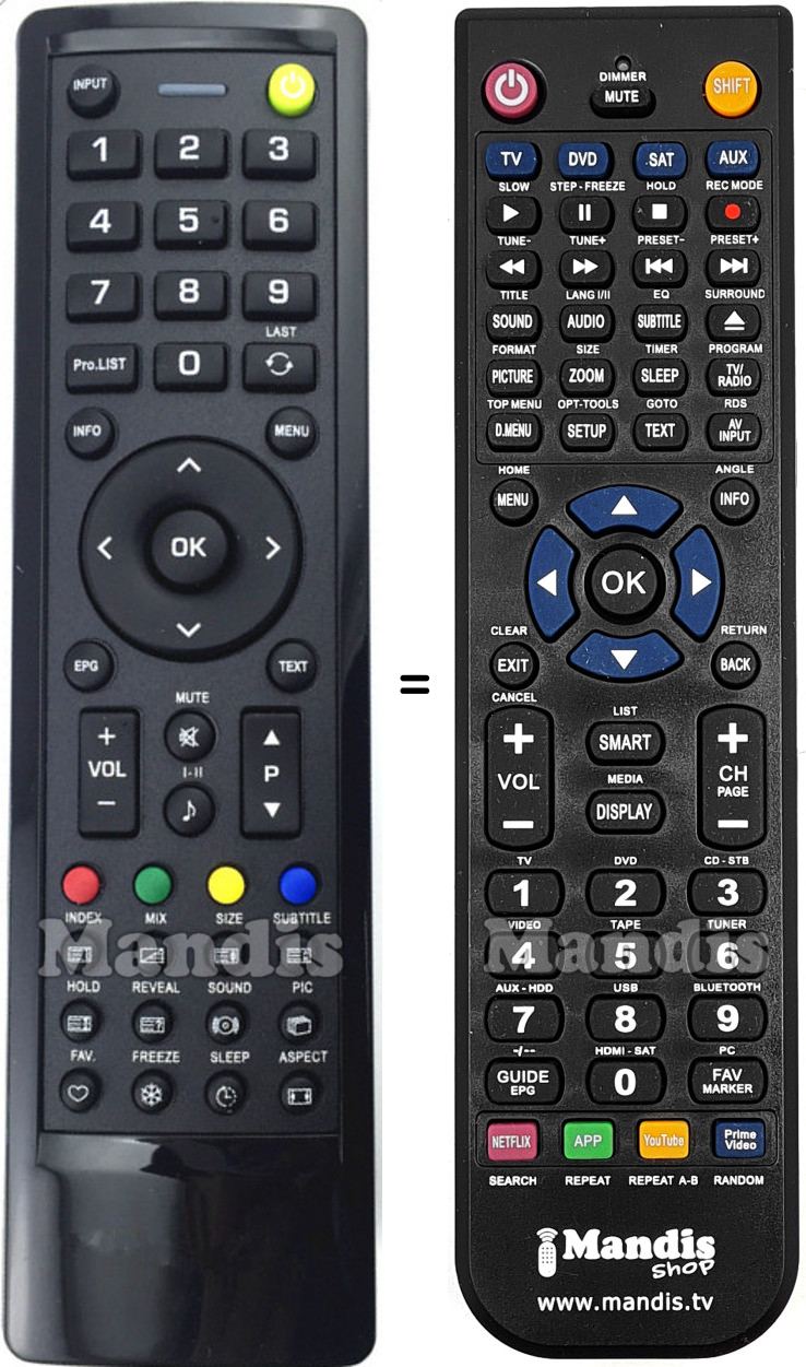 Below, we will show you the correspondence between each button on the original remote control and the button that performs the same function on the replacement remote control. In some cases, you may need to press the SHIFT key before pressing another button to perform certain actions. These additional functions are often not widely used and are included to facilitate understanding of the replacement remote control, or because the original remote control has more buttons than its equivalent.