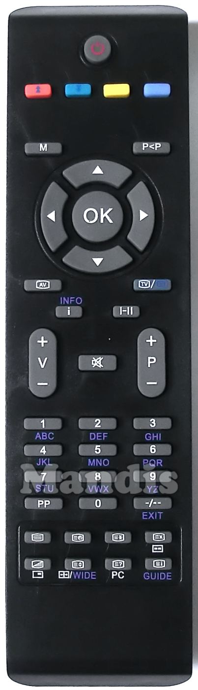 Power, Red, Green, Yellow, Blue, M, P<P, Up, Down, Right, Left, OK, AV, TV/Rad, Info, I-II, Mute, Vol+, Vol-, P+, P-, 1, 2, 3, 4, 5, 6, 7, 8, 9, PP, 0, -/--/Exit, [=], [=o], [=+], [=x], [.=]/[ *], [=♦]/[+]/Wide, [=?]/PC, [=i]/Guide