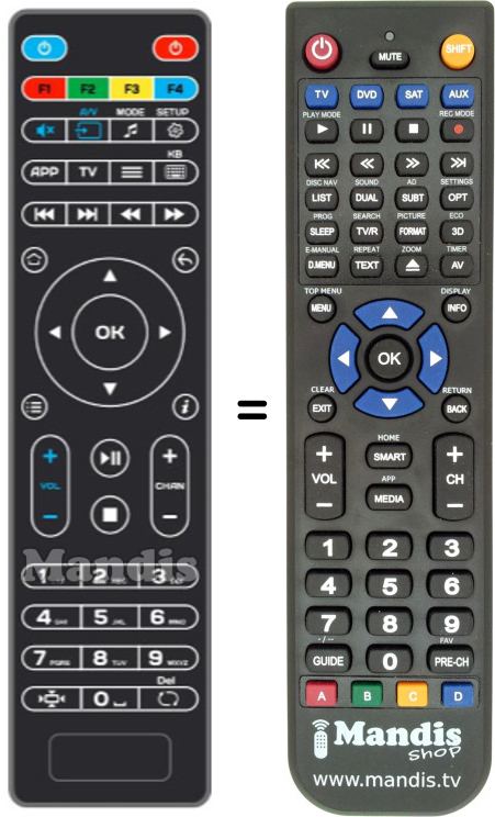 Below, we will show you the correspondence between each button on the original remote control and the button that performs the same function on the replacement remote control. In some cases, you may need to press the SHIFT key before pressing another button to perform certain actions. These additional functions are often not widely used and are included to facilitate understanding of the replacement remote control, or because the original remote control has more buttons than its equivalent.