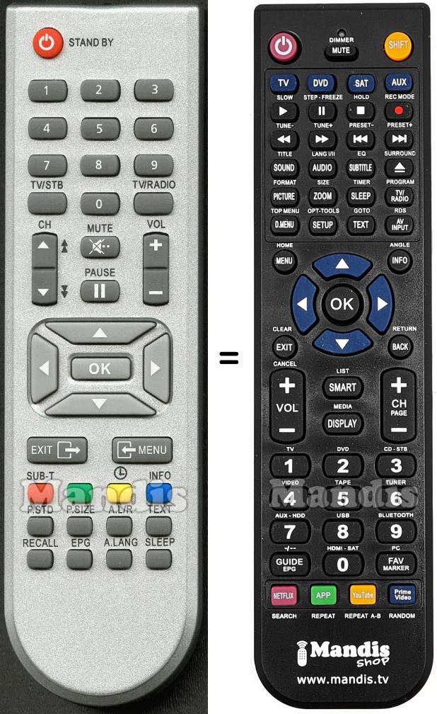 Below, we will show you the correspondence between each button on the original remote control and the button that performs the same function on the replacement remote control. In some cases, you may need to press the SHIFT key before pressing another button to perform certain actions. These additional functions are often not widely used and are included to facilitate understanding of the replacement remote control, or because the original remote control has more buttons than its equivalent.