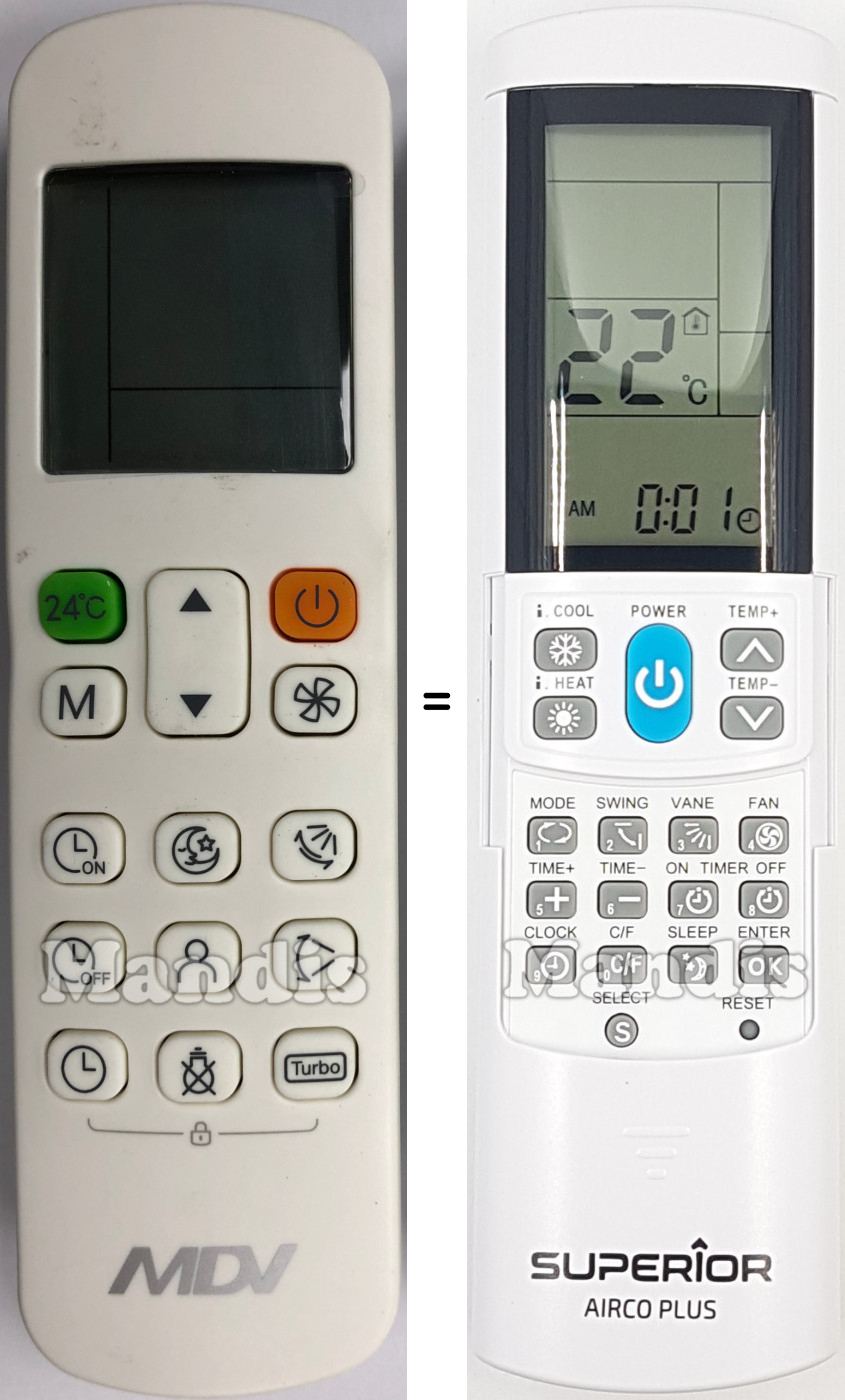 My LG air-conditioner's remote died and need replacement. AircoPlus did the job. I should point out that the code match did not correspond according to manufacturer's table. Let the auto-search code set up do the work. Also, excellent service by Mandis Remotes with a well-protected package.