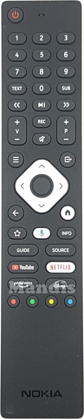 Power, 1, 2, 3, 4, 5, 6, 7, 8, 9, 0, Text, Sub, >>, Play/Pause, <<, V+, V-, P+, P-, Rec, Mute, =, [→], Home, ←, Up, Down, Right, Left, OK, *, Voice, Info, Guide, Source, YouTube, Netflix, prime video, Disney+, Red, Green, Yellow, Blue