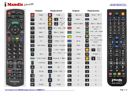 This remote control performs all the functions of the original remote control: Power, 3D, Input TV, Input AV, Menu, Aspect, N, Surround, i, Exit, Viera Tools, Internet, Guide, Up, Down, Right, Left, OK, Option, Return / Back, Red, Green, Yellow, Blue, Text, STTL, Index, Hold, 1, 2, 3, 4, 5, 6, 7, 8, 9, 0, Mute, Last View, Vol +, VOl -, CH +, CH -, Power 2, Programme -, Programme +, << / I<<, >> / >>I, Play, Stop, Pause / Slow, Rec