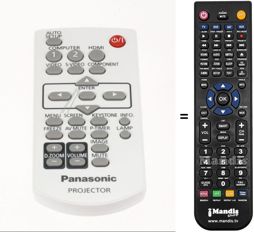 Below, we will show you the correspondence between each button on the original remote control and the button that performs the same function on the replacement remote control. In some cases, you may need to press the SHIFT key before pressing another button to perform certain actions. These additional functions are often not widely used and are included to facilitate understanding of the replacement remote control, or because the original remote control has more buttons than its equivalent.