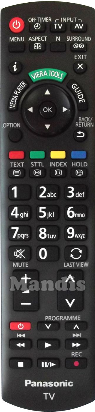 POWER, OFF TIMER, INPUT TV, INPUT AV, AUDIO, ASPECT, N, SURROUND, I, EXIT, OPTION, BACK/RETURN, OK, UP, DOWN, RIGHT, LEFT, VIERA TOOLS, GUIDE, MEDIA PLAYER, RED, GREEN, YELLOW, BLUE, TEXT, STTL, INDEX, HOLD, 1, 2, 3, 4, 5, 6, 7, 8, 9, 0, MUTE, LAST VIEW, VOL+, VOL-, PR+, PR-, Power↓, Programme ▼, Programme ▲, <<, >>, PLAY, STOP, PAUSE, REC
