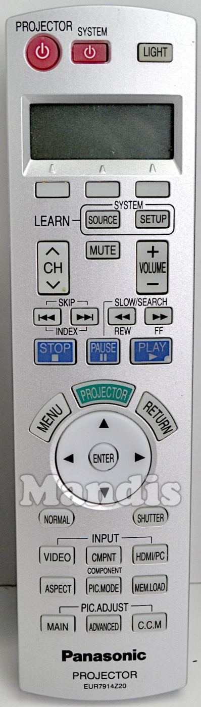 Projector Power, System Power, Light, System Source, System Setup, CH+, CH-, Mute, Volume+, Volume-, I<<, >>I, <<, >>, Stop, Pause, Play, Projector, Menu, Return, Up, Left, Enter, Right, Down, Normal, Shutter, Input Video, Input Component, Input HDMI/PC, Aspect, Pic.Mode, Mem.Load, Pic.Adjust Main, Pic.Adjust Advanced, Pic.Adjust C.C.M