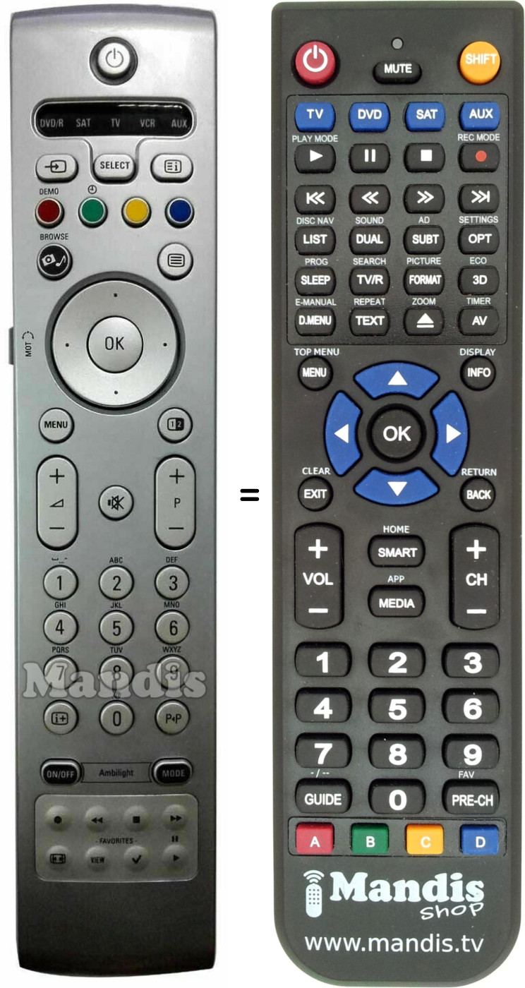 Below, we will show you the correspondence between each button on the original remote control and the button that performs the same function on the replacement remote control. In some cases, you may need to press the SHIFT key before pressing another button to perform certain actions. These additional functions are often not widely used and are included to facilitate understanding of the replacement remote control, or because the original remote control has more buttons than its equivalent.