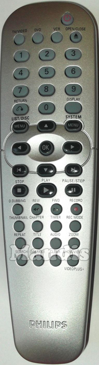 Power, TV/Video, DVD, VCR, Open / Close, 1, 2, 3, 4, 5, 6, 7, 8, 9, 0, Return, Display, List / Disc Menu, System Menu, Up, Left, OK, Right, Down, I<, >I, Stop, Play, Pause / Step, D.Dubbing, << REW, >> FWD, Record, Thumbnail, Chapter, Timer, Rec Mode, Repeat, Title, Audio, Zoom, Search, Marker, Clear, Showview / Video Plus+