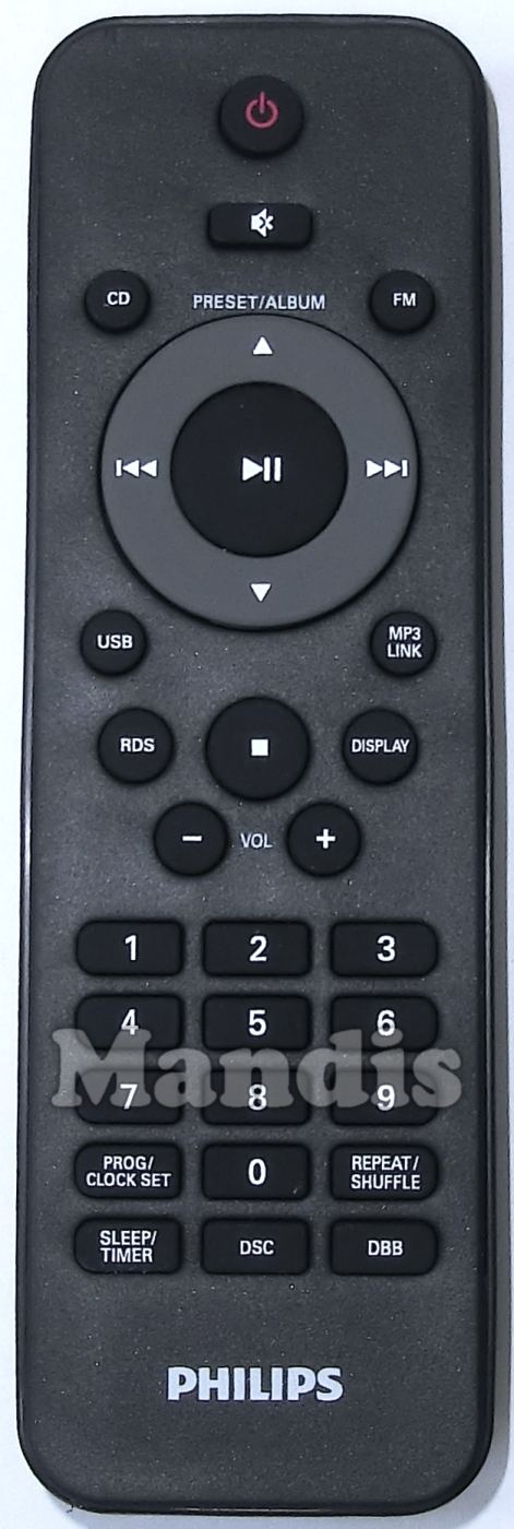 Power, Mute, Preset/Album Up, Preset/Album Down, >>I, I<<, Play/Pause, RDS, Display, Vol+, Vol-, Stop, 1, 2, 3, 4, 5, 6, 7, 8, 9, Prog/Clock Set, 0, Repeat/Shuffle, Sleep/Timer, DSC, DBB