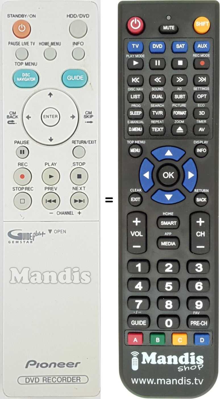 Below, we will show you the correspondence between each button on the original remote control and the button that performs the same function on the replacement remote control. In some cases, you may need to press the SHIFT key before pressing another button to perform certain actions. These additional functions are often not widely used and are included to facilitate understanding of the replacement remote control, or because the original remote control has more buttons than its equivalent.