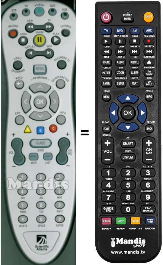 Remote control to replace the original ScientificAtlanta001 and all its functions.