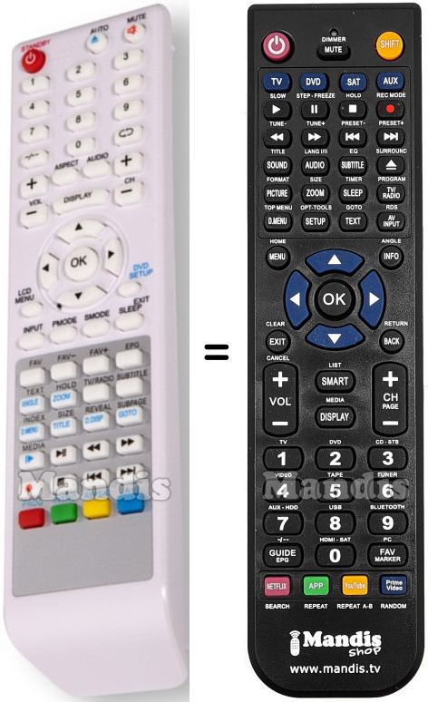 Below, we will show you the correspondence between each button on the original remote control and the button that performs the same function on the replacement remote control. In some cases, you may need to press the SHIFT key before pressing another button to perform certain actions. These additional functions are often not widely used and are included to facilitate understanding of the replacement remote control, or because the original remote control has more buttons than its equivalent.