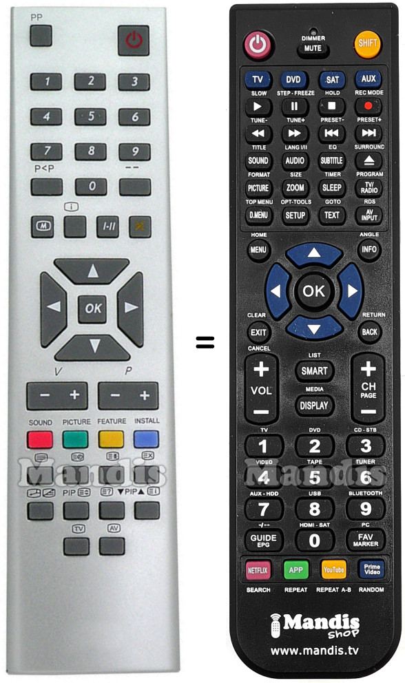 Below, we will show you the correspondence between each button on the original remote control and the button that performs the same function on the replacement remote control. In some cases, you may need to press the SHIFT key before pressing another button to perform certain actions. These additional functions are often not widely used and are included to facilitate understanding of the replacement remote control, or because the original remote control has more buttons than its equivalent.