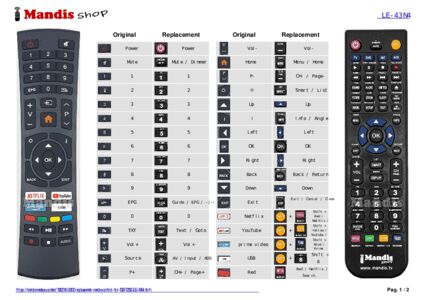 This remote control fully replaces your DVB-T2S2C (LE-43N4) and offers all the functions of the original.