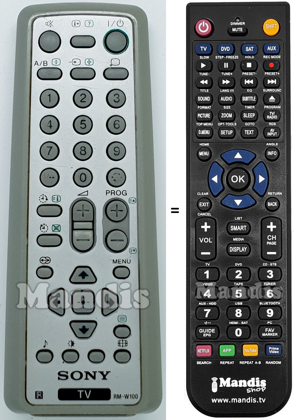 This remote control fully replaces your RM-W100 (147800711) and offers all the functions of the original.