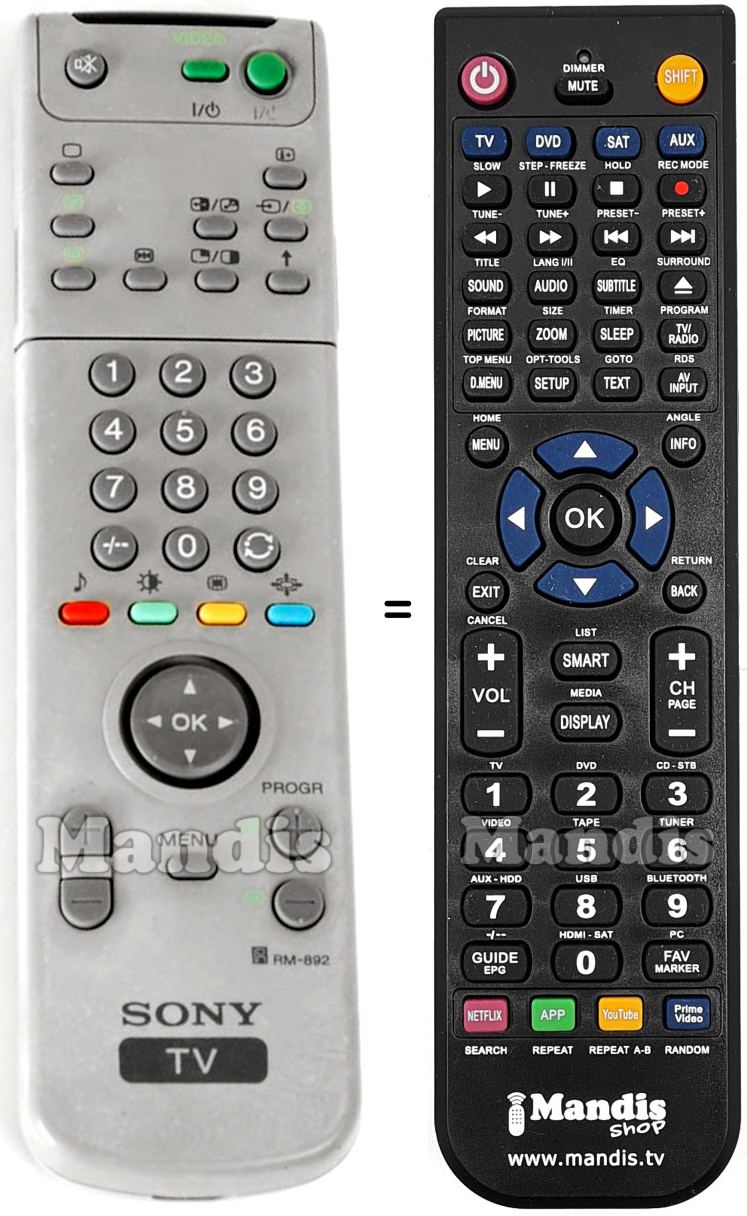 This remote control fully replaces your RM-892 (141857211) and offers all the functions of the original.