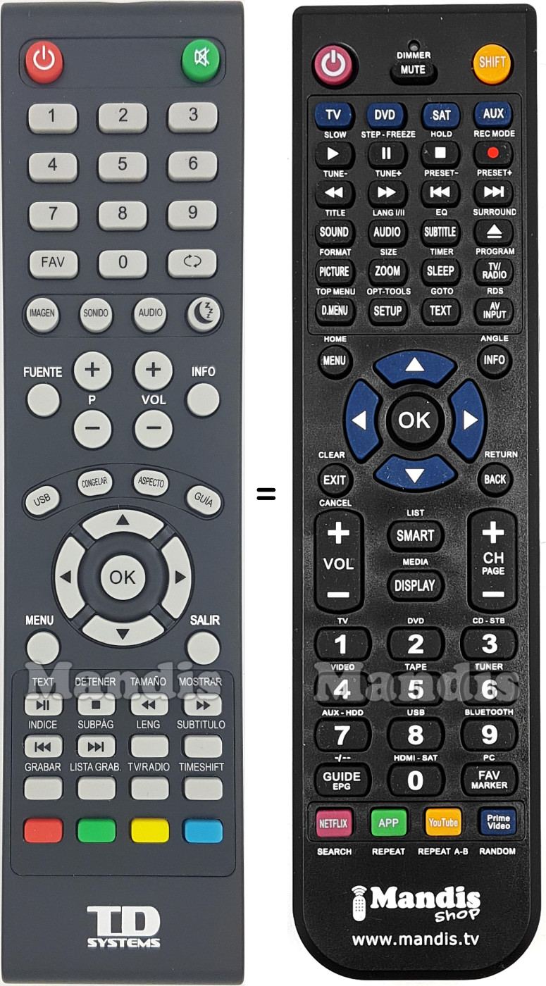 Below, we will show you the correspondence between each button on the original remote control and the button that performs the same function on the replacement remote control. In some cases, you may need to press the SHIFT key before pressing another button to perform certain actions. These additional functions are often not widely used and are included to facilitate understanding of the replacement remote control, or because the original remote control has more buttons than its equivalent.