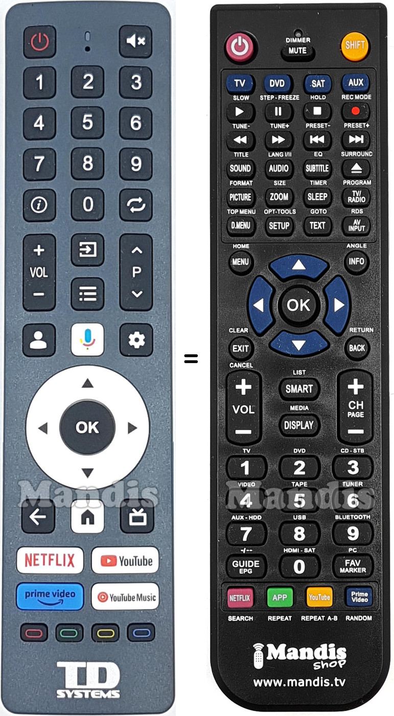 Below, we will show you the correspondence between each button on the original remote control and the button that performs the same function on the replacement remote control. In some cases, you may need to press the SHIFT key before pressing another button to perform certain actions. These additional functions are often not widely used and are included to facilitate understanding of the replacement remote control, or because the original remote control has more buttons than its equivalent.