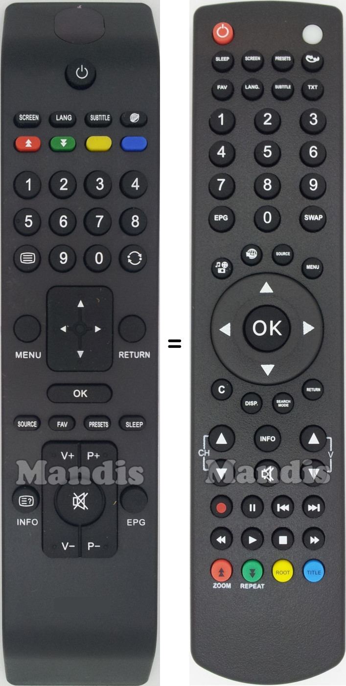 Power, Sleep, Screen, Presets, ↔, FAV, Lang, Subtitle, TXT, 1, 2, 3, 4, 5, 6, 7, 8, 9, 0, EPG, Swap, Photo/Music/Movie, World, Source, Menu, OK, Up, Down, Right, Left, C, Disp., Search Mode, Return, CH+, CH-, Vol+, Vol-, Info, Mute, Rec, Pause, I<<, >>I, <<, Play, Stop, >>, Red/↑/Zoom, Green/↓/Repeat, Yellow/Root, Blue/Title