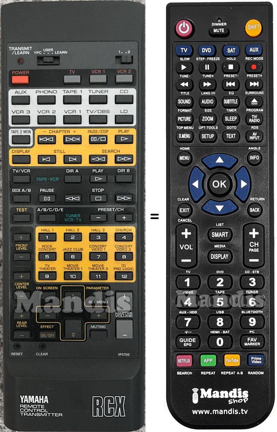 Below, we will show you the correspondence between each button on the original remote control and the button that performs the same function on the replacement remote control. In some cases, you may need to press the SHIFT key before pressing another button to perform certain actions. These additional functions are often not widely used and are included to facilitate understanding of the replacement remote control, or because the original remote control has more buttons than its equivalent.