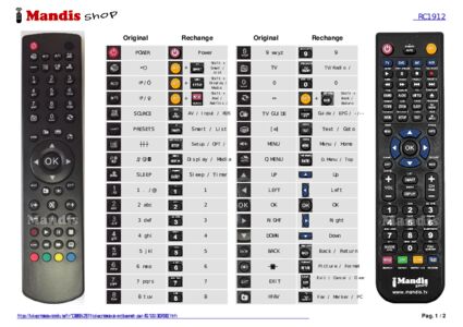 Cette télécommande remplit toutes les fonctions de la télécommande d'origine: Power, Red, Green, Yellow, Blue, M, Return, Source, Presets, Up, Right, Down, Left, OK, Info, EPG, Mute, V +, V -, P +, P -, 1, 2, 3, 4, 5, 6, 7, 8, 9, 0, Fav, Back, Screen, Lang, Subtitle, Sleep, (O), O/World, [=x], [=]