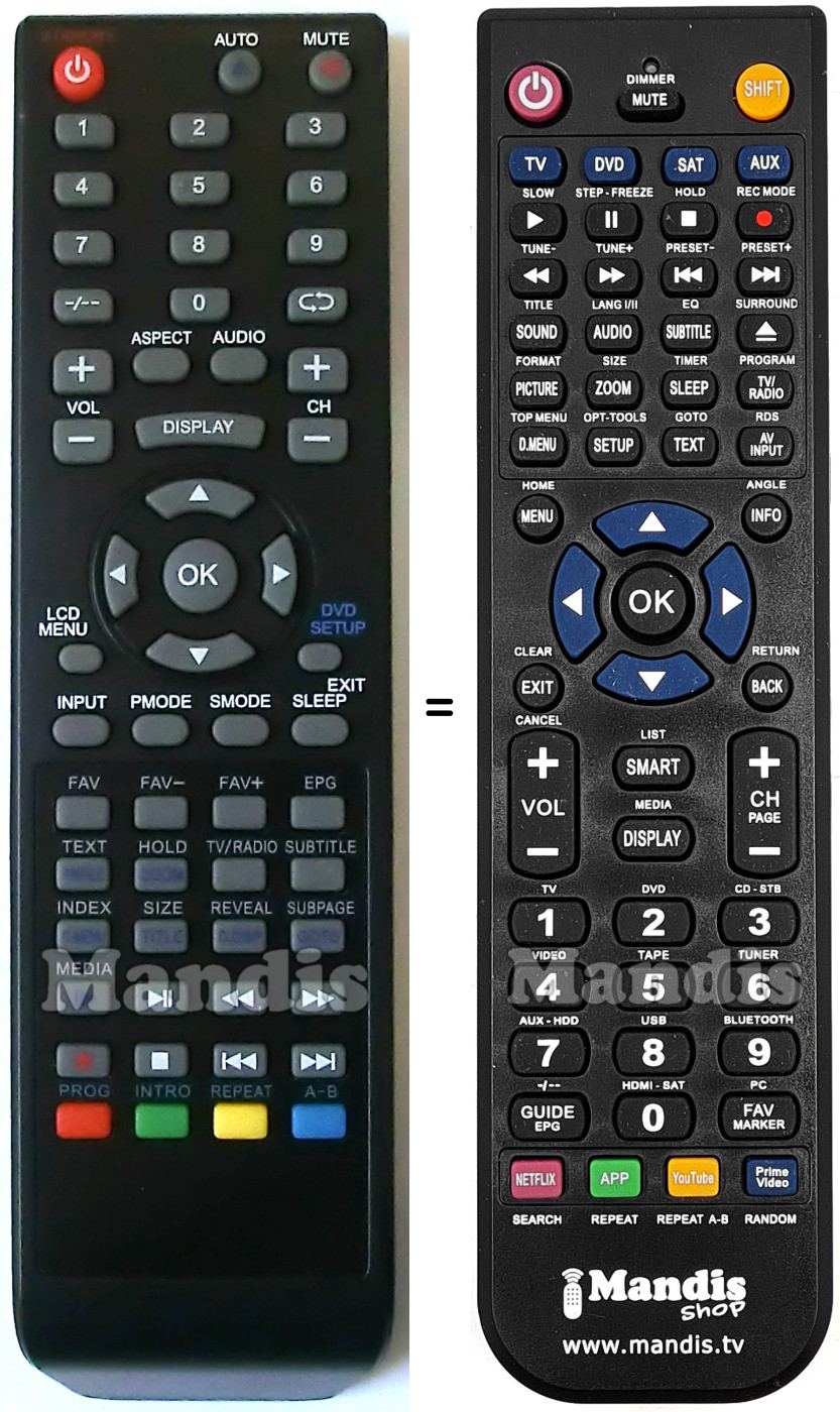 Ci-dessous, nous vous montrerons la correspondance entre chaque bouton de la télécommande d'origine et le bouton qui effectue la même fonction sur la télécommande de remplacement. Dans certains cas, vous devrez peut-être appuyer sur la touche SHIFT avant d'appuyer sur un autre bouton pour effectuer certaines actions. Ces fonctions supplémentaires sont souvent peu utilisées et sont incluses pour faciliter la compréhension de la télécommande de remplacement, ou parce que la télécommande d'origine comporte plus de boutons que son équivalent.