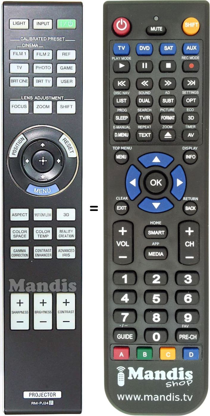 Power, Light, Input, FILM 1, FILM 2, REF, TV, PHOTO, GAME, BRT CINE, BRT TV, USER, Focus, Zoom, Shift, Position, Reset, Up, Left, Enter, Right, Down, Menu, Aspect, Motion Flow, 3D, Color Space, Color Temp, Reality Creation, Gamma Correction, Contrast Enhancer, Advanced Iris, Sharpness+, Sharpness-, Brightness+, Brightness-, Contrast+, Contrast-