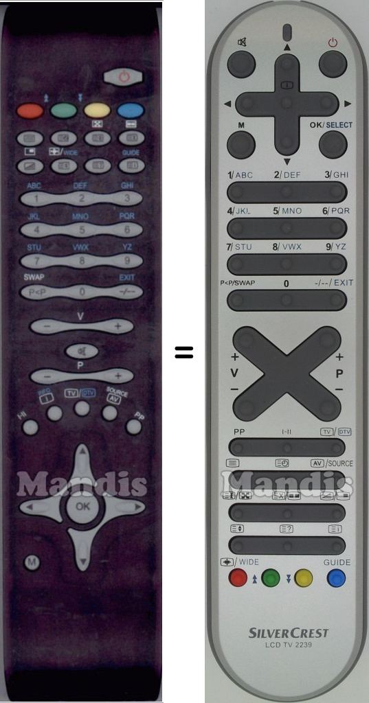 Mute, Power, M, OK/Select, Up, Down, Right, Left, [i], 1, 2, 3, 4, 5, 6, 7, 8, 9, 0, P<P/Swap, -/--/ Exit, Vol+, Vol-, P+, P-, PP, I-II, Tv/DTV, [=], [=O], AV/Source, [=+]/[X], [=X]/[▪▪], [.=]/[ ▪], [=♦], [=?], [=i], Red/[+]/Wide/↑, Green/↓, Yellow, Blue/Guide