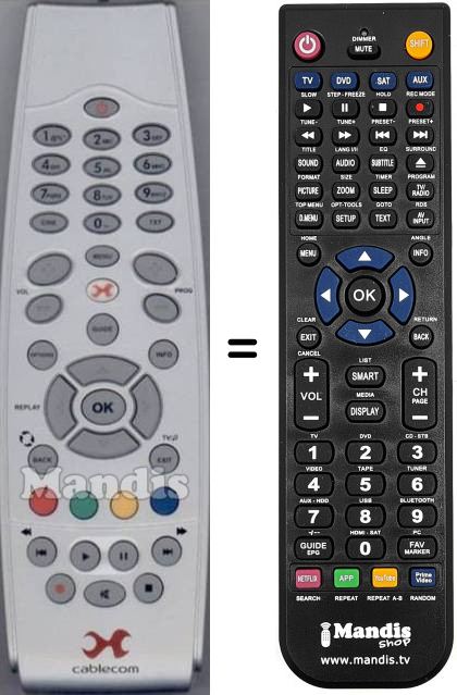 Télécommande qui remplace la télécommande d'origine Cablecom (RC39870R00) car elle possède les mêmes fonctions.