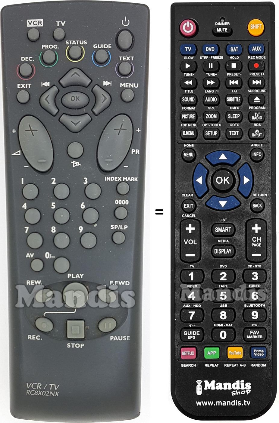 Ci-dessous, nous vous montrerons la correspondance entre chaque bouton de la télécommande d'origine et le bouton qui effectue la même fonction sur la télécommande de remplacement. Dans certains cas, vous devrez peut-être appuyer sur la touche SHIFT avant d'appuyer sur un autre bouton pour effectuer certaines actions. Ces fonctions supplémentaires sont souvent peu utilisées et sont incluses pour faciliter la compréhension de la télécommande de remplacement, ou parce que la télécommande d'origine comporte plus de boutons que son équivalent.