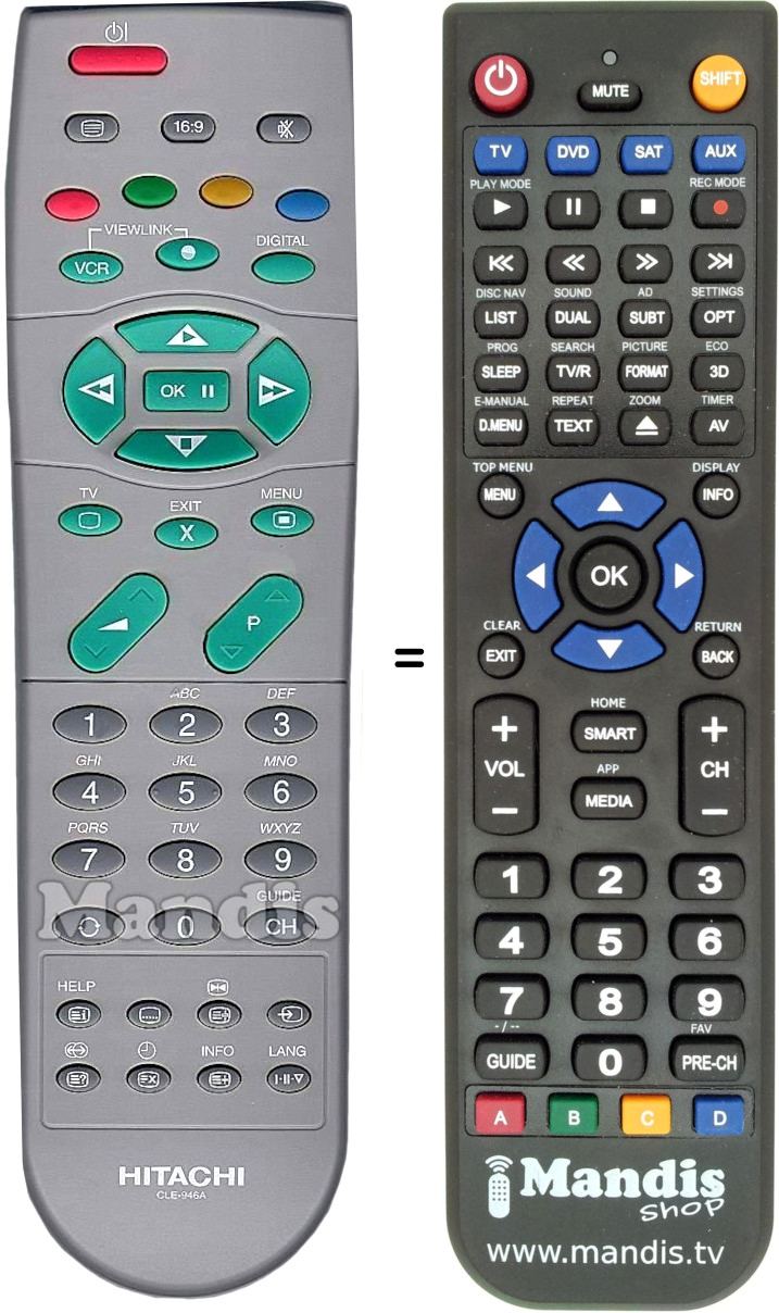 Ci-dessous, nous vous montrerons la correspondance entre chaque bouton de la télécommande d'origine et le bouton qui effectue la même fonction sur la télécommande de remplacement. Dans certains cas, vous devrez peut-être appuyer sur la touche SHIFT avant d'appuyer sur un autre bouton pour effectuer certaines actions. Ces fonctions supplémentaires sont souvent peu utilisées et sont incluses pour faciliter la compréhension de la télécommande de remplacement, ou parce que la télécommande d'origine comporte plus de boutons que son équivalent.