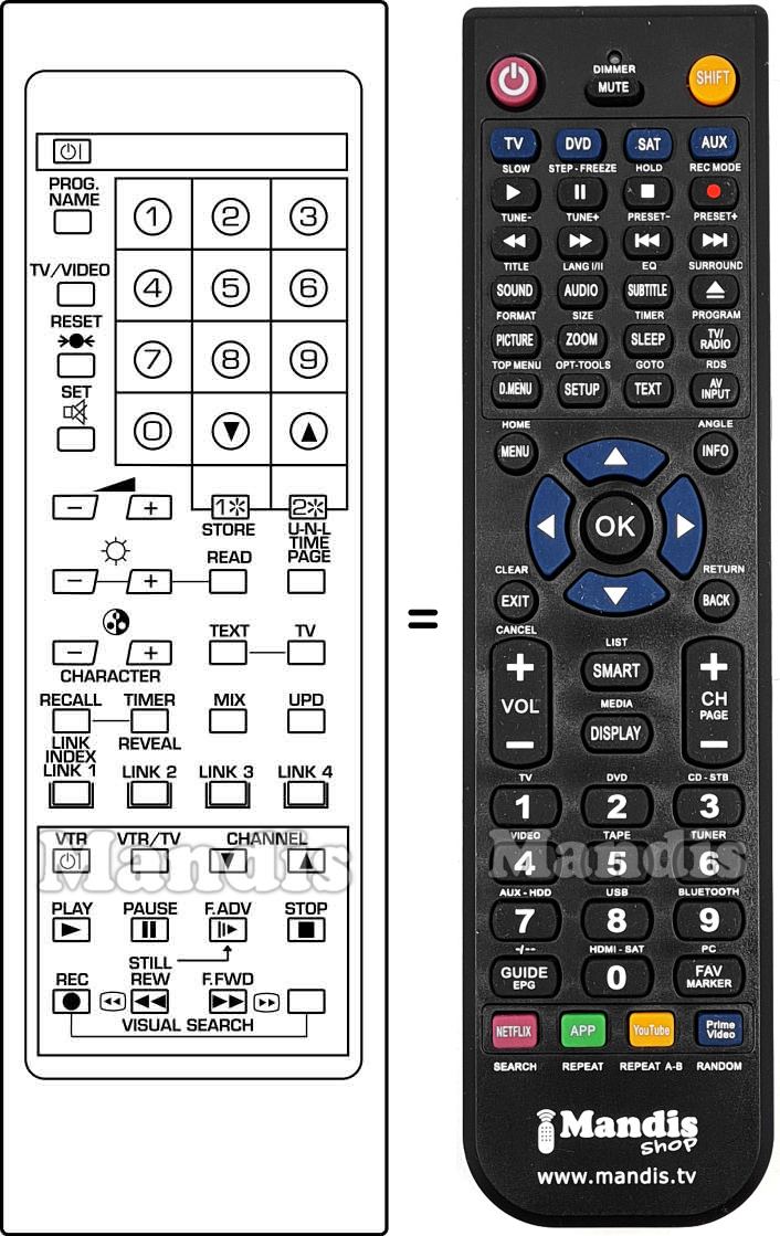 Ci-dessous, nous vous montrerons la correspondance entre chaque bouton de la télécommande d'origine et le bouton qui effectue la même fonction sur la télécommande de remplacement. Dans certains cas, vous devrez peut-être appuyer sur la touche SHIFT avant d'appuyer sur un autre bouton pour effectuer certaines actions. Ces fonctions supplémentaires sont souvent peu utilisées et sont incluses pour faciliter la compréhension de la télécommande de remplacement, ou parce que la télécommande d'origine comporte plus de boutons que son équivalent.
