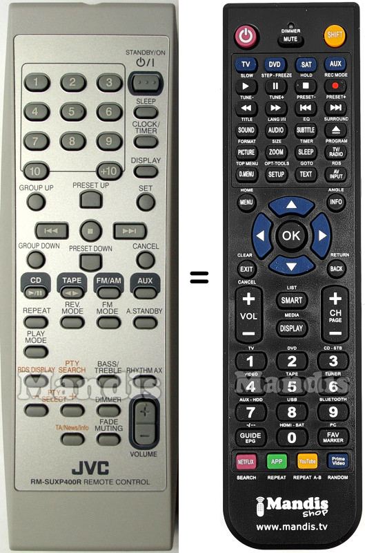 Ci-dessous, nous vous montrerons la correspondance entre chaque bouton de la télécommande d'origine et le bouton qui effectue la même fonction sur la télécommande de remplacement. Dans certains cas, vous devrez peut-être appuyer sur la touche SHIFT avant d'appuyer sur un autre bouton pour effectuer certaines actions. Ces fonctions supplémentaires sont souvent peu utilisées et sont incluses pour faciliter la compréhension de la télécommande de remplacement, ou parce que la télécommande d'origine comporte plus de boutons que son équivalent.