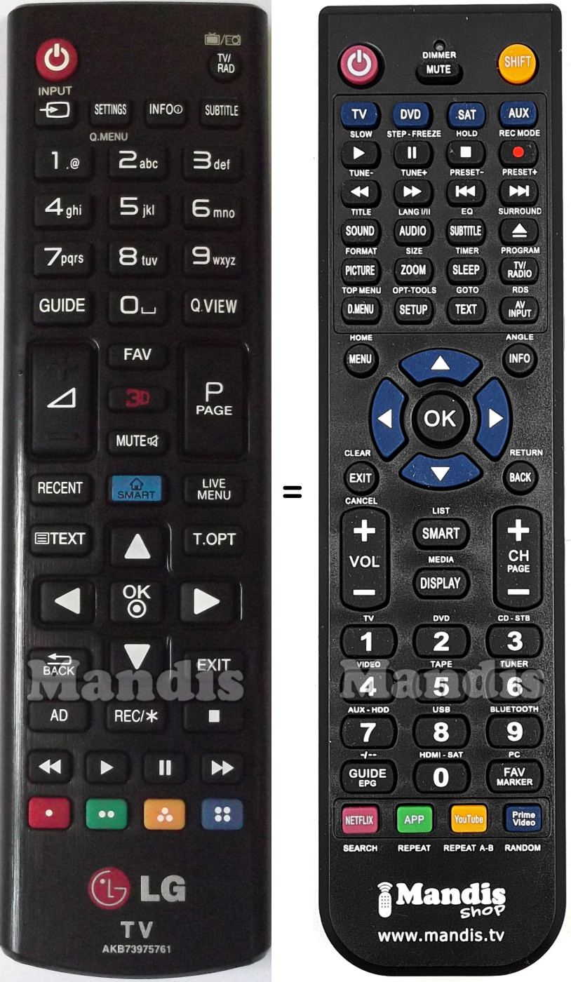 Cette télécommande remplit toutes les fonctions de la télécommande d'origine: Power, TV / Rad, Input, Settings / Q.Menu, Info, Subtitle, 1, 2, 3, 4, 5, 6, 7, 8, 9, 0, Guide, Q.View, Vol +, Vol -, Fav, 3D, Mute, P+ / Page+, P- / Page-, Recent, Smart, Live Menu, Text, T.Opt, Up, Down, Right, Left, OK, Back, Exit, AD, Rec / *, Stop, <<, Play, Pause, >>, Red, Green, Yellow, Blue