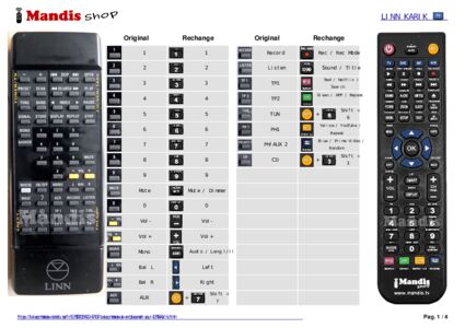Cette télécommande remplit toutes les fonctions de la télécommande d'origine: - Tuner/TV, + Tuner/TV, Preset Tuner/TV, Scan Tuner/TV, Tune Tuner/TV, Band Tuner/TV, Signal Tuner/TV, Store Tuner/TV, Mono/Narrow Tuner/TV, I<< Skip CD/VCR/TAPE, Skip >>I CD/VCR/TAPE, Open CD/VCR/TAPE, << Search CD/VCR/TAPE, Search >> CD/VCR/TAPE, Play CD/VCR/TAPE, < Index CD/VCR/TAPE, Index > CD/VCR/TAPE, Pause CD/VCR/TAPE, Display CD/VCR/TAPE, Repeat CD/VCR/TAPE, Stop CD/VCR/TAPE, 1, 2, 3, 4, 5, 6, 7, 8, 9, 0, On/Off KNEKT, Where KNEKT, What KNEKT, ? KNEKT, DO KNEKT, ◴ KNEKT, :⋮: KNEKT, :⋮: KNEKT, Mute PREAMP, Vol- PREAMP, Vol+ PREAMP, L Bal PREAMP, R Bal PREAMP, Mono PREAMP, AUX PREAMP, Record PREAMP, Listen PREAMP, TP 1 PREAMP, TP 2 PREAMP, TUN PREAMP, PH 1 PREAMP, PH/AUX 2 PREAMP, CD PREAMP