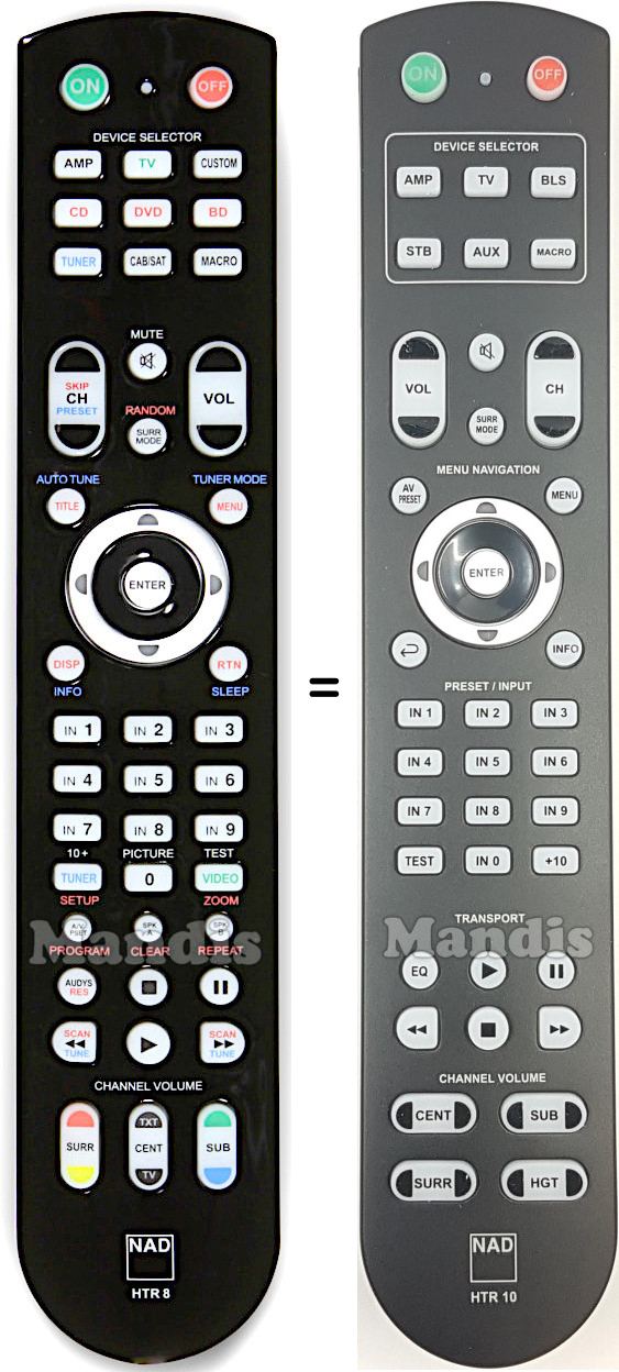 Cette télécommande a les boutons suivants : On, Off, AMP, TV, BLS, STB, AUX, Macro, Mute, Surr Mode, Vol+, Vol-, CH+, CH-, Menu, AV Mode, Info, Back, Up, Down, Right, Left, Enter, IN 1, IN 2, IN 3, IN 4, IN 5, IN 6, IN 7, IN 8, IN 9, IN 0, +10, Test, Play BLS, Pause BLS, << BLS, Stop BLS, >> BLS, Channel Volume Cent+, Channel Volume Cent-, Channel Volume Sub-, Channel Volume Sub+, Channel Volume Surr-, Channel Volume Surr+, Channel Volume HGT-, Channel Volume HGT+, EQ