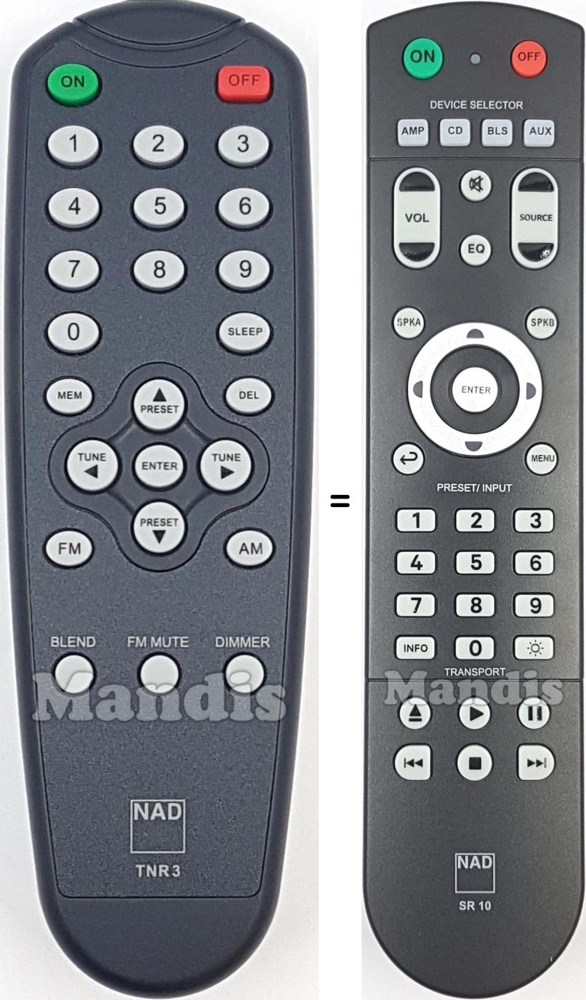 Télécommandes équivalentes qui remplacent la télécommande NAD SR10 et possèdent exactement les mêmes fonctions :