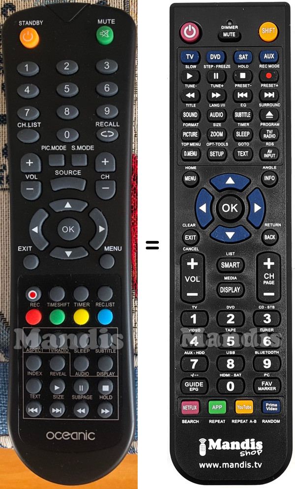Ci-dessous, nous vous montrerons la correspondance entre chaque bouton de la télécommande d'origine et le bouton qui effectue la même fonction sur la télécommande de remplacement. Dans certains cas, vous devrez peut-être appuyer sur la touche SHIFT avant d'appuyer sur un autre bouton pour effectuer certaines actions. Ces fonctions supplémentaires sont souvent peu utilisées et sont incluses pour faciliter la compréhension de la télécommande de remplacement, ou parce que la télécommande d'origine comporte plus de boutons que son équivalent.