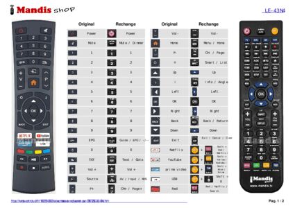 Cette télécommande remplace entièrement votre DVB-T2S2C (LE-43N4) et offre toutes les fonctions de l'originale.