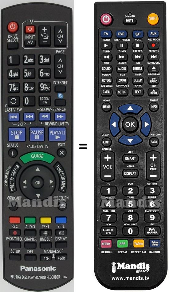 Ci-dessous, nous vous montrerons la correspondance entre chaque bouton de la télécommande d'origine et le bouton qui effectue la même fonction sur la télécommande de remplacement. Dans certains cas, vous devrez peut-être appuyer sur la touche SHIFT avant d'appuyer sur un autre bouton pour effectuer certaines actions. Ces fonctions supplémentaires sont souvent peu utilisées et sont incluses pour faciliter la compréhension de la télécommande de remplacement, ou parce que la télécommande d'origine comporte plus de boutons que son équivalent.