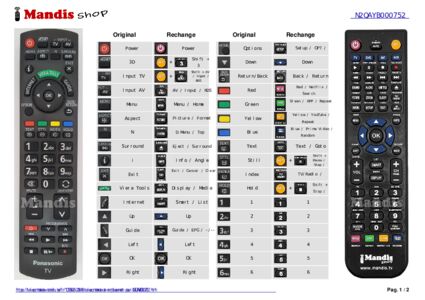 Cette télécommande remplit toutes les fonctions de la télécommande d'origine: Power, 3D, Input TV, Input AV, Menu, Aspect, N, Surround, i, Exit, Viera Tools, Internet, Guide, Up, Down, Right, Left, OK, Option, Return / Back, Red, Green, Yellow, Blue, Text, STTL, Index, Hold, 1, 2, 3, 4, 5, 6, 7, 8, 9, 0, Mute, Last View, Vol +, VOl -, CH +, CH -, Power 2, Programme -, Programme +, << / I<<, >> / >>I, Play, Stop, Pause / Slow, Rec